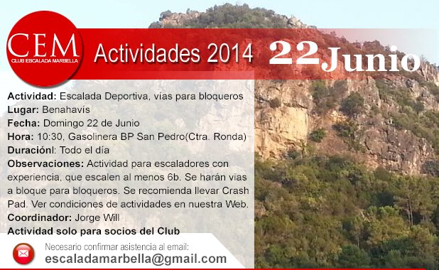 Necesario confirmar asistencia al email del Club, escaladamarbella@gmail.com, con al menos 24 horas de antelación a la actividad para los socios federados y 48 horas para los no federados. Obligatorio en caso de no estar federado, contratar seguro de accidentes por un día.