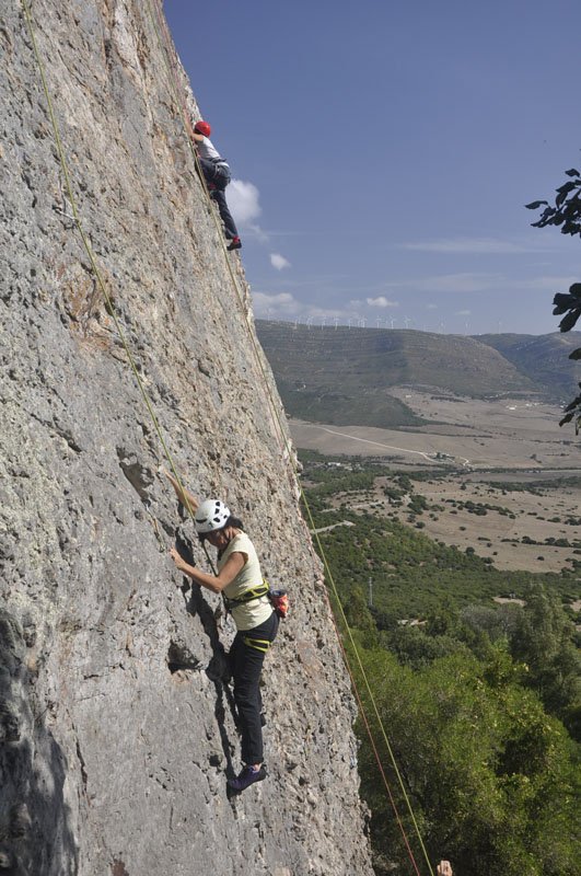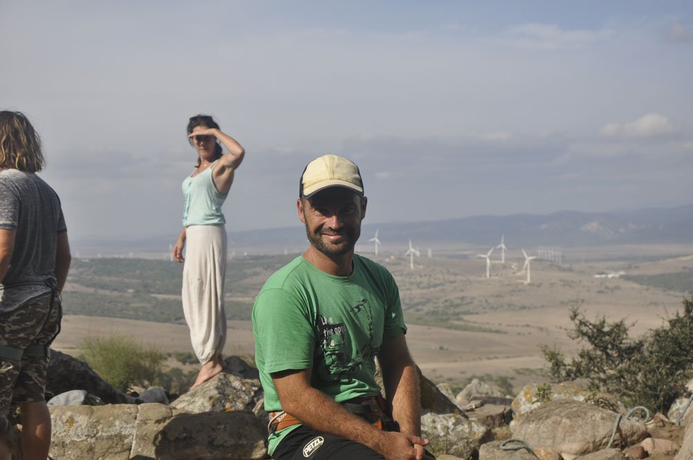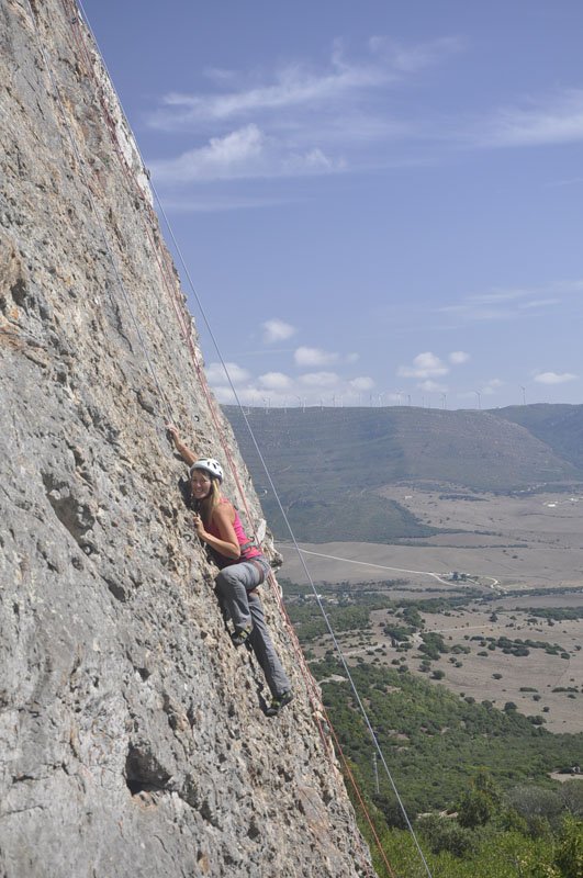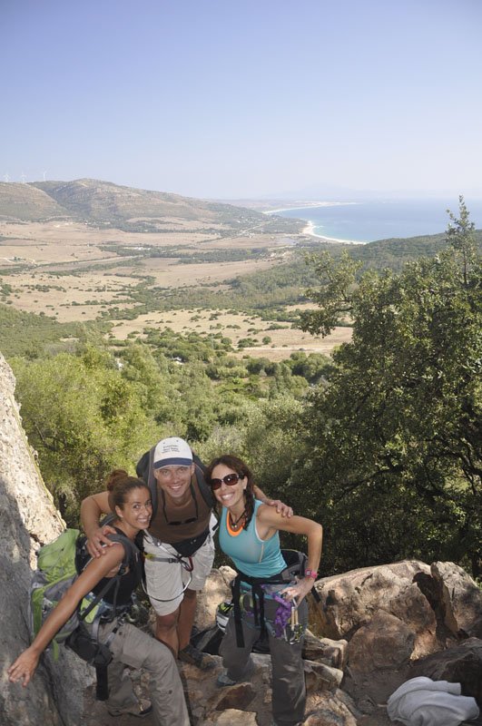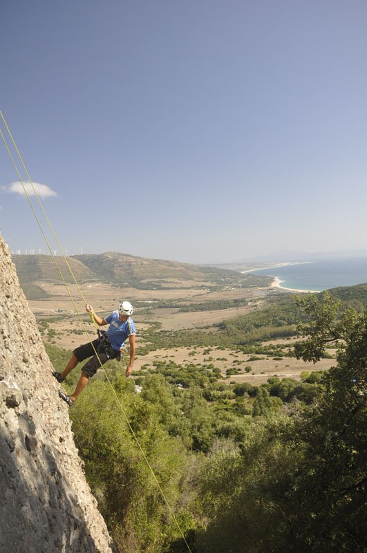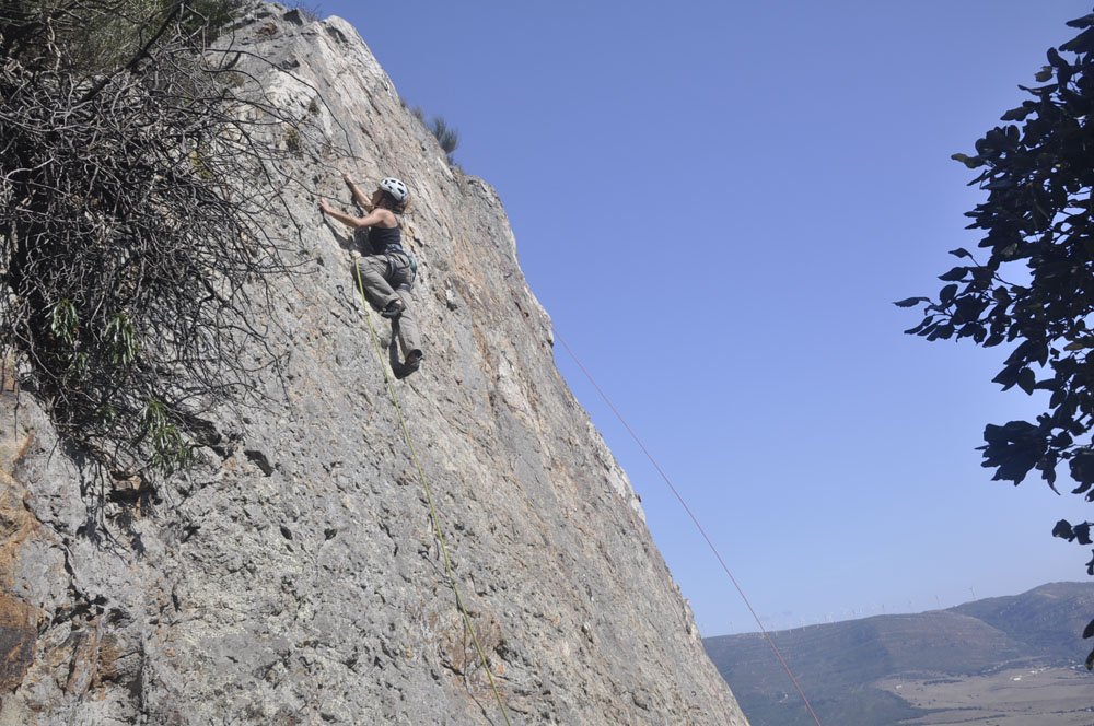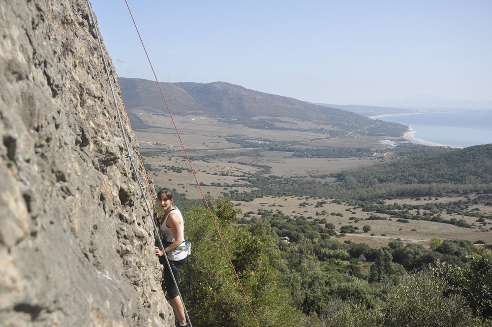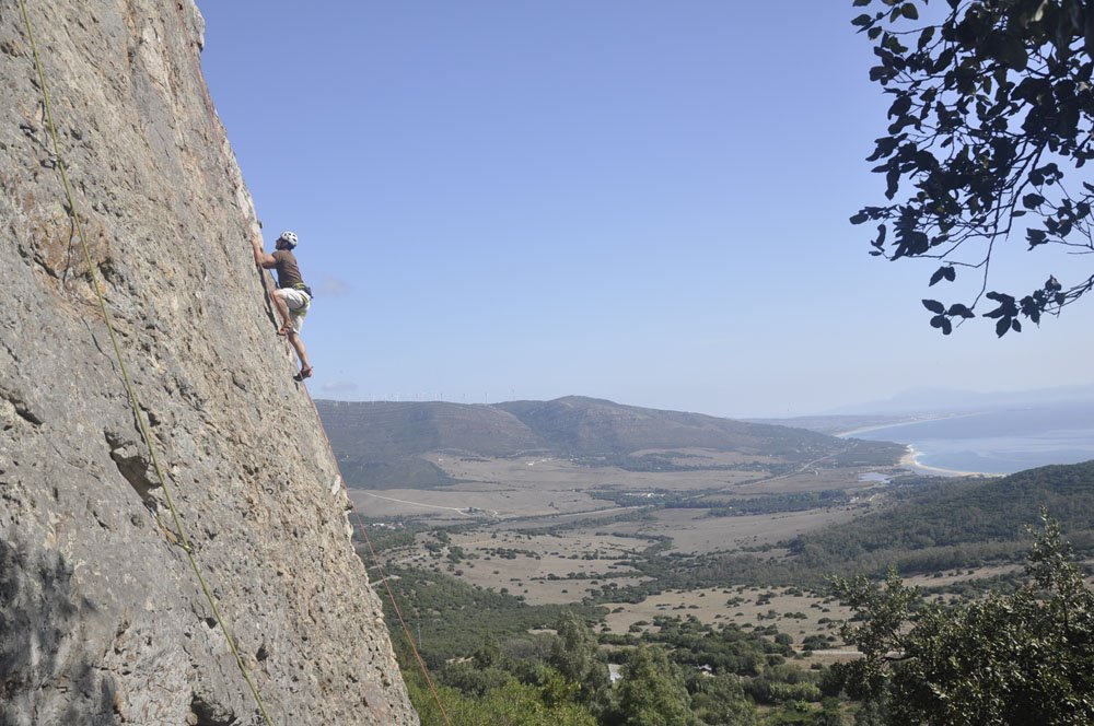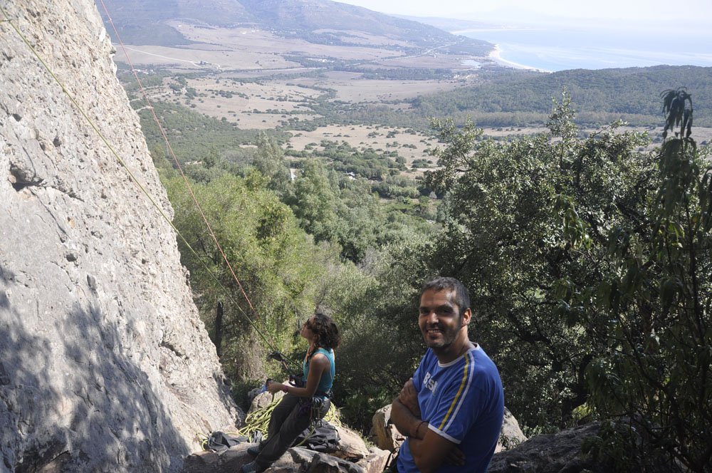 Rumbo a San Bartolo y, tras una breve parada para comprar pan al horno de leña en la Panadería España (recomendado con acierto por Pedro Soto), llegamos al aparcamiento de la zona de escalada. La primera mirada hacia arriba ya hace que la adrenalina comience a correr por las venas. Cuando llegas arriba y miras las vistas que tienes a tu alrededor dices: “¡¡Qué pasada!!” Se ve toda la playa de Valdevaqueros, la playa de Los Lances y la Isla de Tarifa, todo el Estrecho y la zona norte de África. En una palabra: ‘Espectacular’.