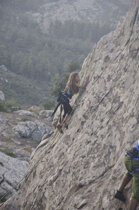 Para el que no lo conozca, San Bartolo se divide en varias zonas. Lo primero que te encuentras al subir es la zona de ‘La Habitación’, dos paredes encontradas con muchos niveles para elegir, aunque la dejamos para hacerla por la tarde ya que estaba bastante ocupada. A la vuelta de la esquina llegamos a la zona ‘Los Cernícalos’, donde nos pegamos toda la mañana. Paredes con muy buenos agarres, montón de huecos y bien equipada, idónea para los que estamos empezando como yo. Después de velar por la vida de casi todos mis compañeros, me tocó subir a mí bajo la supervisión de la anfitriona del CEM, María Maestro, y la tranquilidad que me proporciona Fina (la niña de mis ojos) cuando me asegura. ¿Cuál fue el resultado? Pues está claro: ¡¡Euforia!!