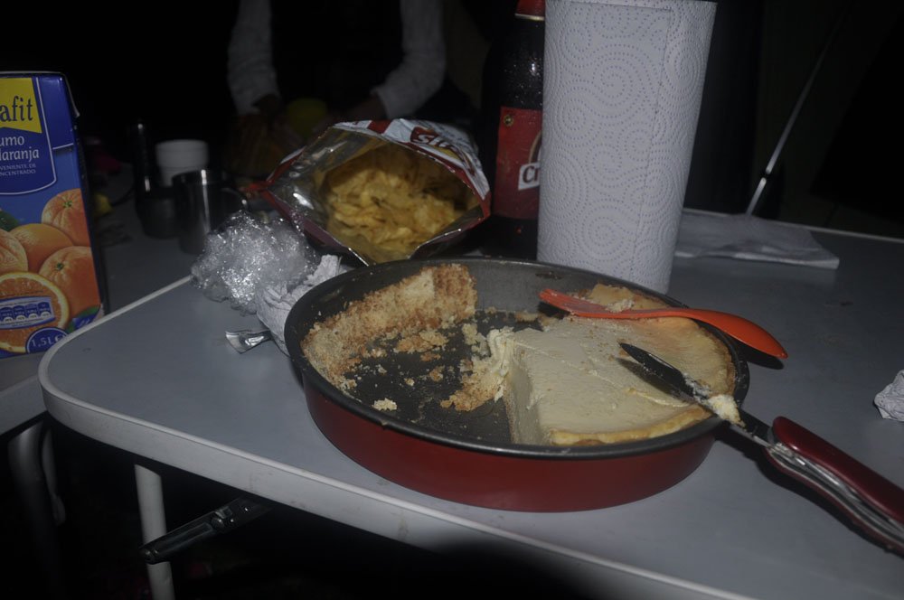 Bueno, después de un día increíble, bajamos al camping. Duchita rápida y a cenar con el resto del grupo. Terminamos el día haciendo piña entorno a las tiendas y las furgonetas para comernos el postre: una tarta de queso “que se te va la cara”!!! Nueva expresión para nuestro diccionario de la mano del palentino Iván. Ya lo decía Pedro Soto: la tarta que hace María está tremenda, no está dulce ni sabe a queso, está buenísima pero no sé cómo la hace… La receta no se la pidas porque está mejor guardada que la de la CocaCola! Lo único que sabemos es que lleva algo de vainilla, tuve que ‘tripitir’.