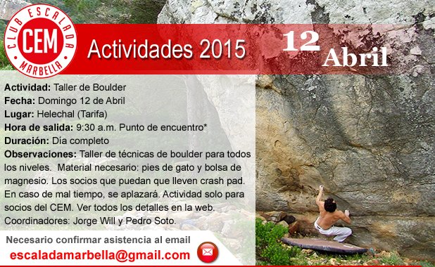 Para poder participar es imprescindible enviar un email al club: escaladamarbella@gmail.com confirmando la participación. No son válidas las llamadas, ni whatsapps, ni hablar con los organizadores de las actividades. Es obligatorio confirmar mediante email al club para poder participar en la actividad. Sin esta confirmación NO se podrá participar en las actividades organizadas por el CEM.
