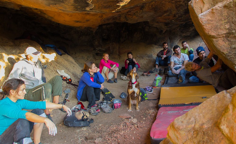 Tras una buena tanda de pegues a los diferentes bloques, decidimos desplazarnos a una de las cuevas que hay a unos 25 metros de donde nos encontramos, tras varios vistazos Dani encuentra la posibilidad de abrir un nuevo bloque en la cueva enlazando desde dentro de la cueva hasta la salida de otro bloque que ya habíamos probado y habían encadenado.