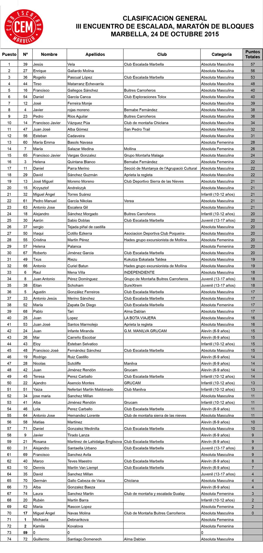 Clasificación General III Encuentro de Escalada Marbella 2015
