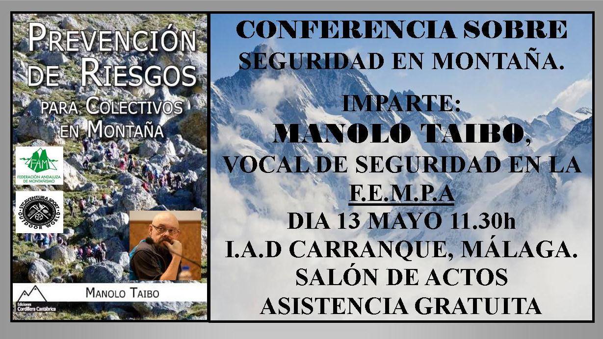 La Consejería de Turismo y Deporte, a través del Instituto Andaluz del Deporte, colabora en la Conferencia sobre Seguridad en la Montaña, organizada por la Federación Andaluza de Montañismo, cuyo objetivo es ofrecer una charla de Manolo Taibo, miembro del Área de Formación del Comité Nacional de Seguridad de la Federación Española de Deportes de Montaña y Escalada, desde 2015 y responsable de Prevención de Riesgos en Montaña de la Federación de Escalada y Montaña del Principado de Asturias, desde 2009, sobre todo lo relacionado con la seguridad en montaña, tanto para cualquier colectivo que practique alguna actividad como a modo individual.
