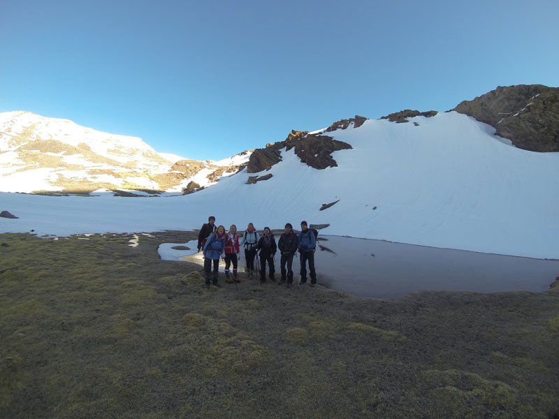 A las 7 estábamos arriba y después de un buen desayuno Lian, Louisse y Richard, que habían hecho noche en Capileira, se incorporaron al grupo. Sobre las 8 de la mañana partimos del refugio con rumbo noroeste hacia la cuenca del Río Mulhacen. Había poca nieve a esta altitud pero a medida que ganábamos altura y las montañas estrechaban su abrazo el silencio y el blanco ganaban intensidad.