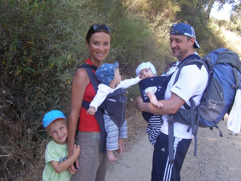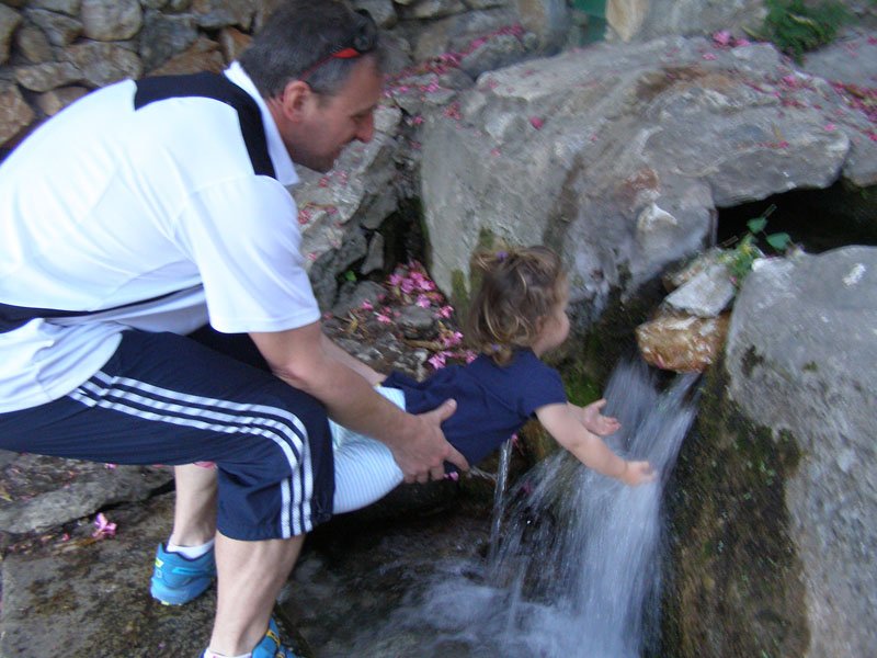 Al bajar del coche mi padre me llevó en el pañuelo. Hacía calor y caminábamos por un bonito lugar, rodeado de huertas y naturaleza salvaje. Me gusta mirar las plantas, los árboles y las flores. También me gusta ir en el pañuelo, pero a veces me aburro o quiero que me coja un poco mi mamá, así que tuvieron que sacarme antes de llegar.