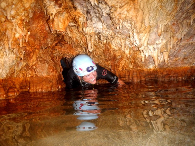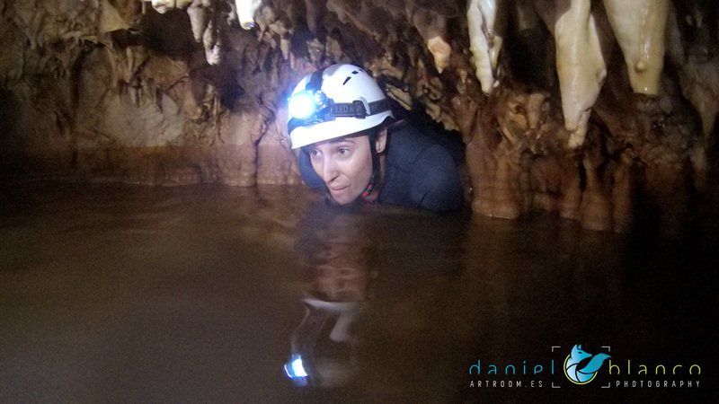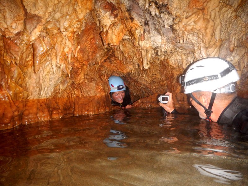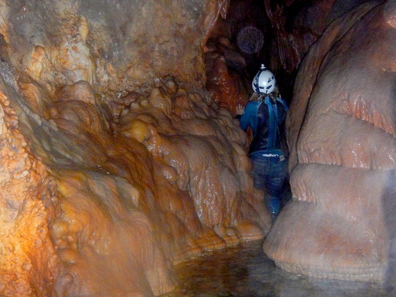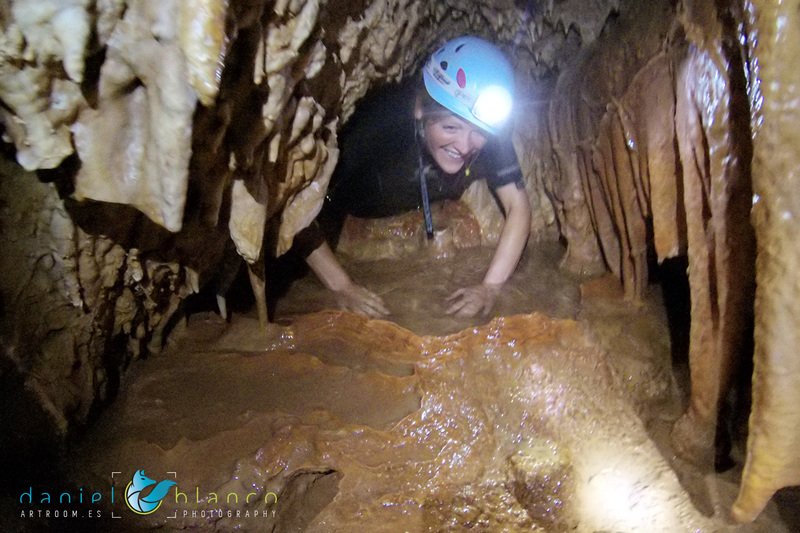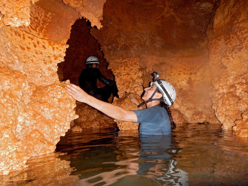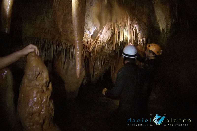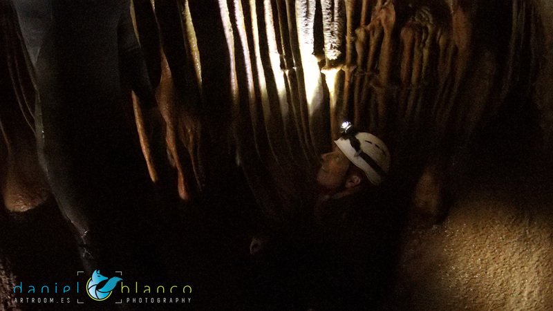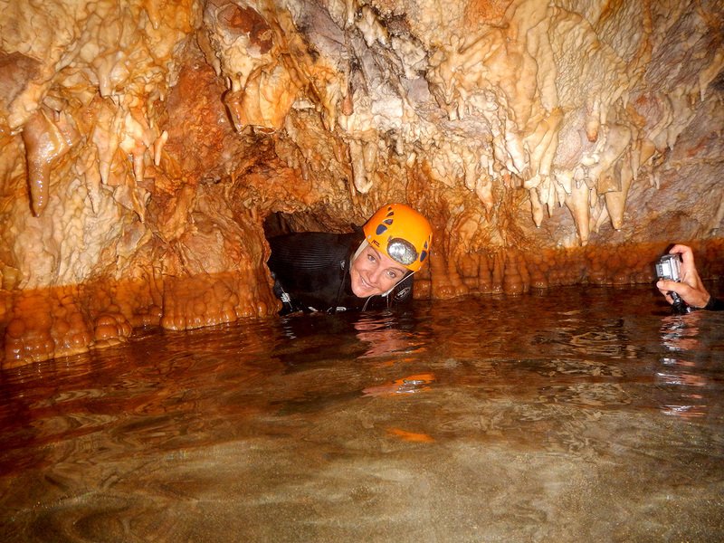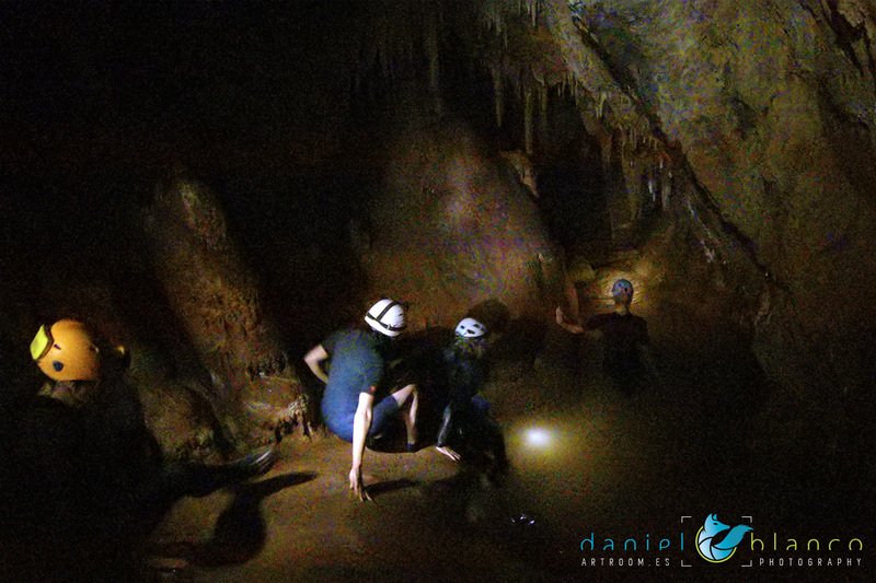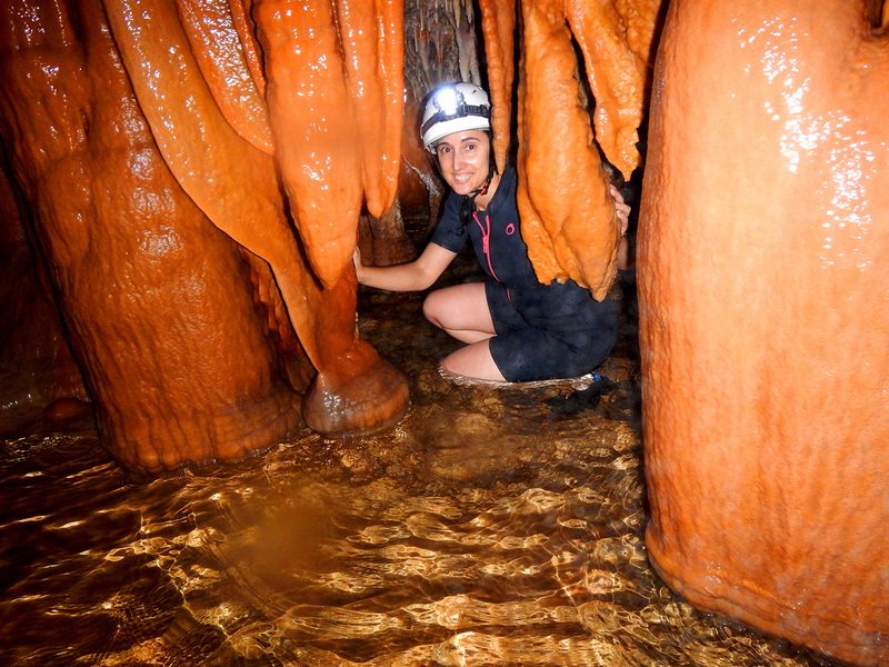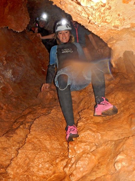 Primero nos adentramos en la cueva de la Excéntrica. La subida hasta la entrada es empinada y rocosa poniendo a prueba nuestros cuadriceps y gemelos, lo cual sirvió estupendamente como calentamiento. El punto de entrada es estrecho, había que pasarlo casi arrastrándose pero daba lugar a una sala espaciosa con techos elevados, permitiendo la progresión de forma cómoda, de pie, en la mayor parte del recorrido, y alejando así cualquier sensación de claustrofobia. Lo que más se podía apreciar eran estalagtitas y estalagmitas, y el color rojizo de las paredes y suelos. Las había de todos los tamaños, pero de formas concéntricas mayormente, de ahí recibe su nombre la cueva. Esta, cuenta con dos partes, una seca y otra húmeda a la que se accede a través de una cuerda. Estábamos tan ensimismados contemplando la riqueza de la roca caliza que a más de uno se nos olvidaba mirar abajo y tener en cuenta que también había un poco de caída y cuando te percatabas se escapaba algún que otro «¡Ahí Dios mio!». Dentro del agua, el recorrido se estrechaba, estabas entre paredes, y podías nadar tranquilamente o caminar e ir viendo y tocando las formaciones a tú paso. Aprovechábamos cualquier trozo de roca parecida a un asiendo para escapar del frio del agua. La naturaleza, que es muy sabia, guarda lo mejor para el final. ¿Quien iba a pensar?, que a través de un hueco sobre el agua parecido a un «anillo» pasaríamos a contemplar un espectaculo «La galería de las excéntricas» con una riqueza en formaciones que quita el sentido: órganos, cortinas, columnas y miles de estalagtitas y estalagmitas decorandolo todo. Antes de salir tuvimos nuestro momento «zen/disfrutón», apagamos las luces de los cascos y nos mantuvimos en silencio escuchando las gotas de agua caer. ¡Fue espectacular!. Una vez fuera la sensación es de haber estado en un verdadero spa. Marisa lo describió perfectamente; ya nunca más volveríamos a pisar aquella zona de la misma manera sabiendo que debajo estaba esa maravilla.