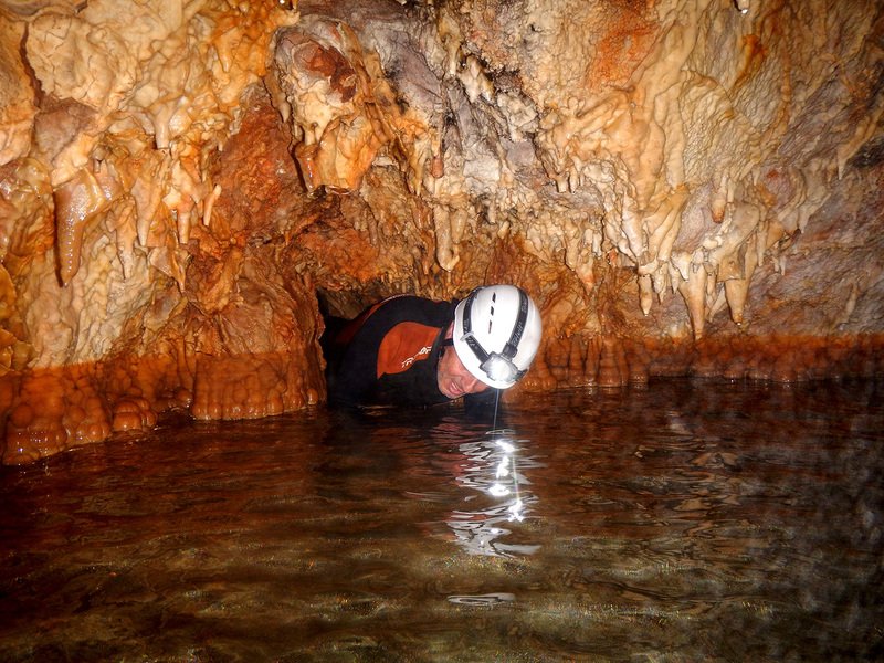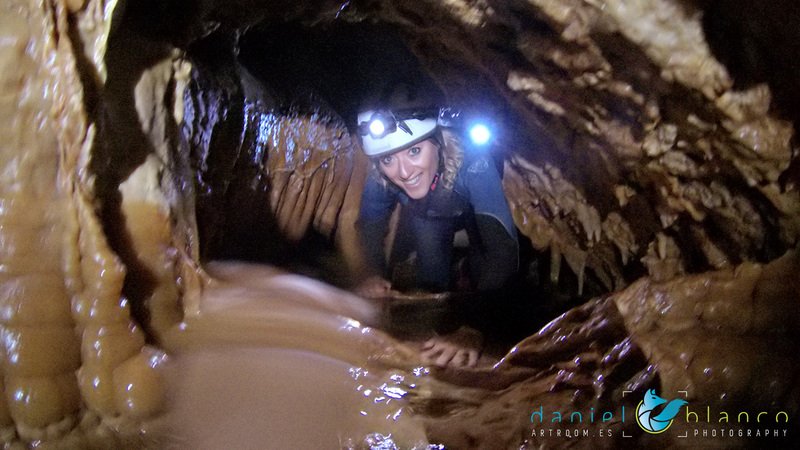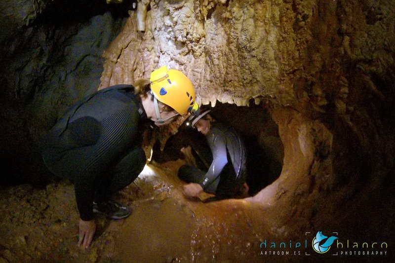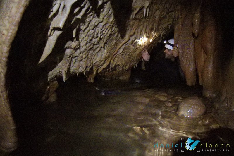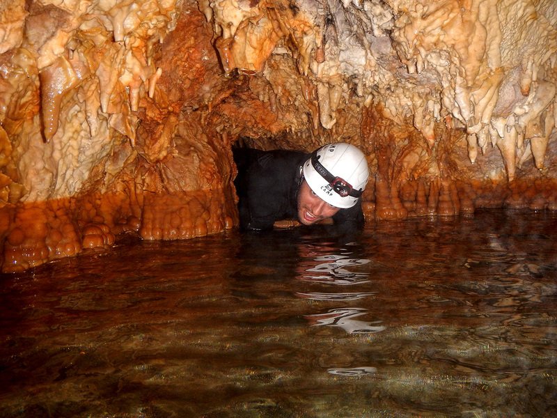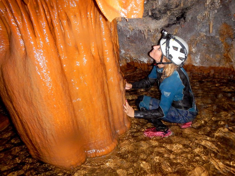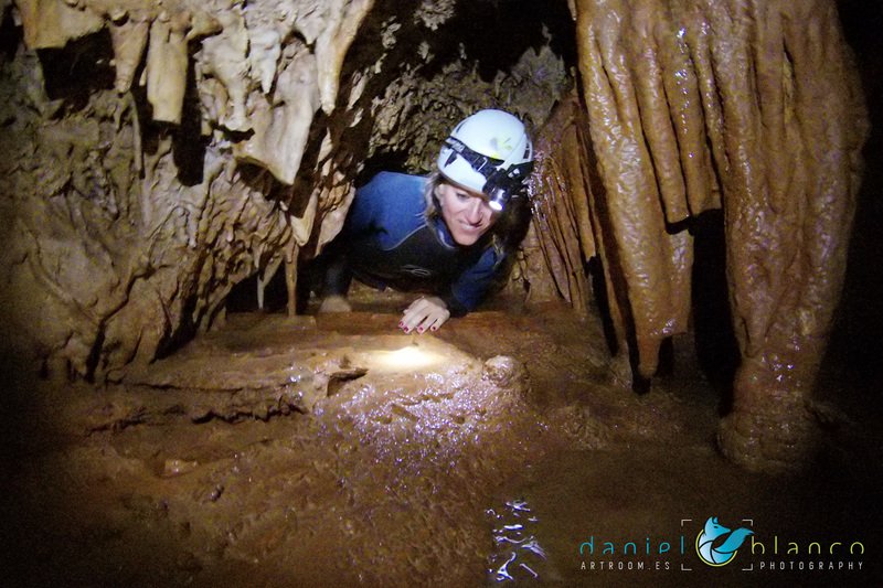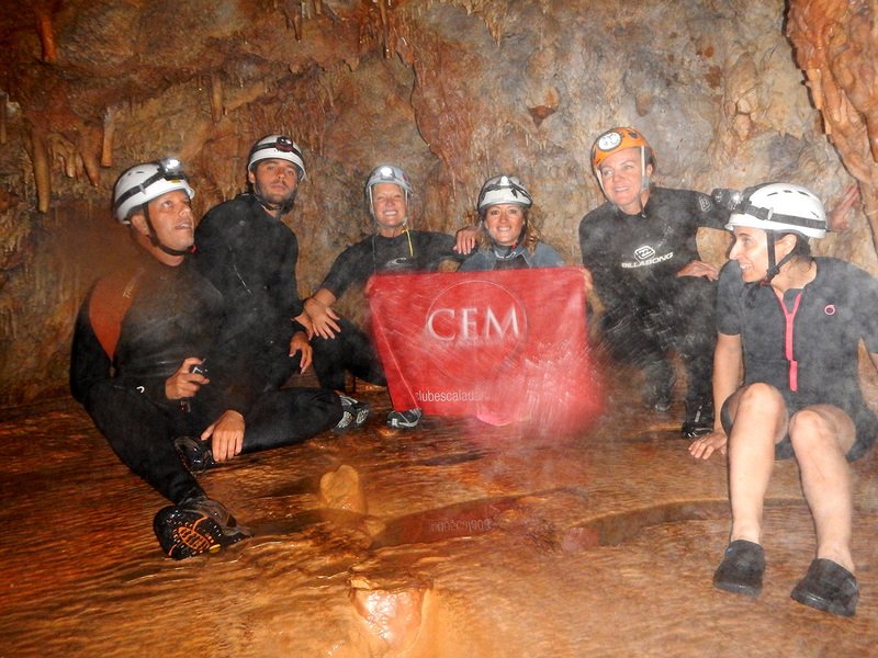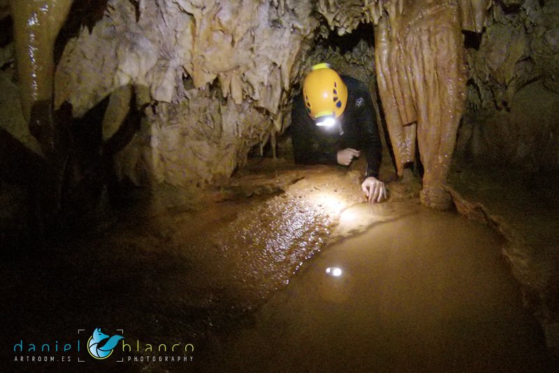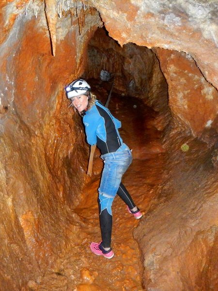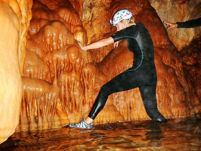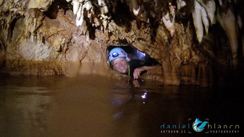 Primero nos adentramos en la cueva de la Excéntrica. La subida hasta la entrada es empinada y rocosa poniendo a prueba nuestros cuadriceps y gemelos, lo cual sirvió estupendamente como calentamiento. El punto de entrada es estrecho, había que pasarlo casi arrastrándose pero daba lugar a una sala espaciosa con techos elevados, permitiendo la progresión de forma cómoda, de pie, en la mayor parte del recorrido, y alejando así cualquier sensación de claustrofobia. Lo que más se podía apreciar eran estalagtitas y estalagmitas, y el color rojizo de las paredes y suelos. Las había de todos los tamaños, pero de formas concéntricas mayormente, de ahí recibe su nombre la cueva. Esta, cuenta con dos partes, una seca y otra húmeda a la que se accede a través de una cuerda. Estábamos tan ensimismados contemplando la riqueza de la roca caliza que a más de uno se nos olvidaba mirar abajo y tener en cuenta que también había un poco de caída y cuando te percatabas se escapaba algún que otro «¡Ahí Dios mio!». Dentro del agua, el recorrido se estrechaba, estabas entre paredes, y podías nadar tranquilamente o caminar e ir viendo y tocando las formaciones a tú paso. Aprovechábamos cualquier trozo de roca parecida a un asiendo para escapar del frio del agua. La naturaleza, que es muy sabia, guarda lo mejor para el final. ¿Quien iba a pensar?, que a través de un hueco sobre el agua parecido a un «anillo» pasaríamos a contemplar un espectaculo «La galería de las excéntricas» con una riqueza en formaciones que quita el sentido: órganos, cortinas, columnas y miles de estalagtitas y estalagmitas decorandolo todo. Antes de salir tuvimos nuestro momento «zen/disfrutón», apagamos las luces de los cascos y nos mantuvimos en silencio escuchando las gotas de agua caer. ¡Fue espectacular!. Una vez fuera la sensación es de haber estado en un verdadero spa. Marisa lo describió perfectamente; ya nunca más volveríamos a pisar aquella zona de la misma manera sabiendo que debajo estaba esa maravilla.