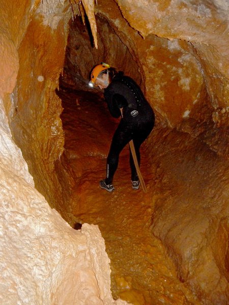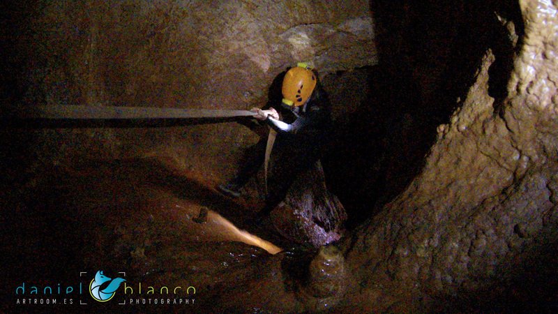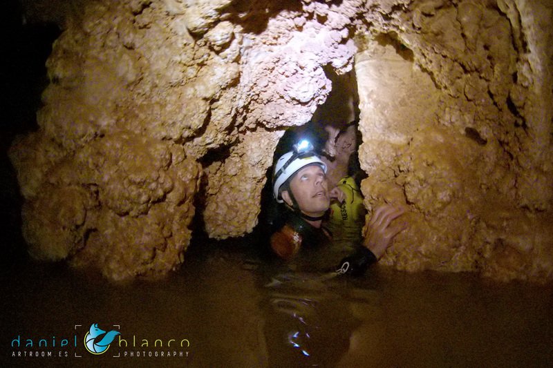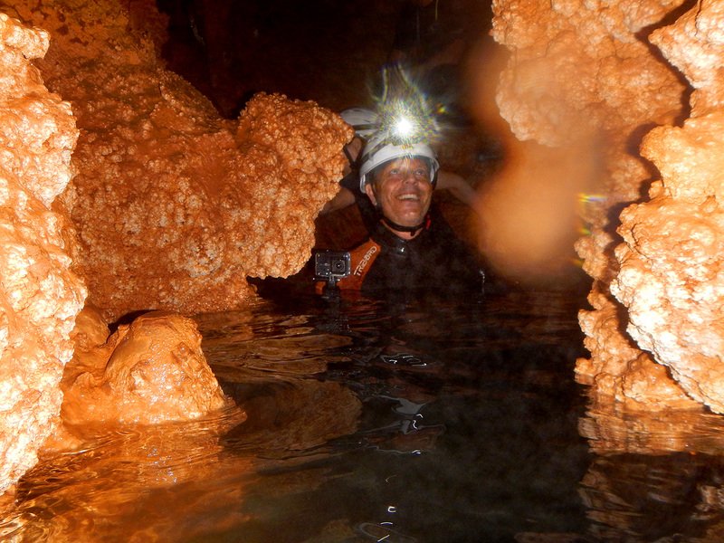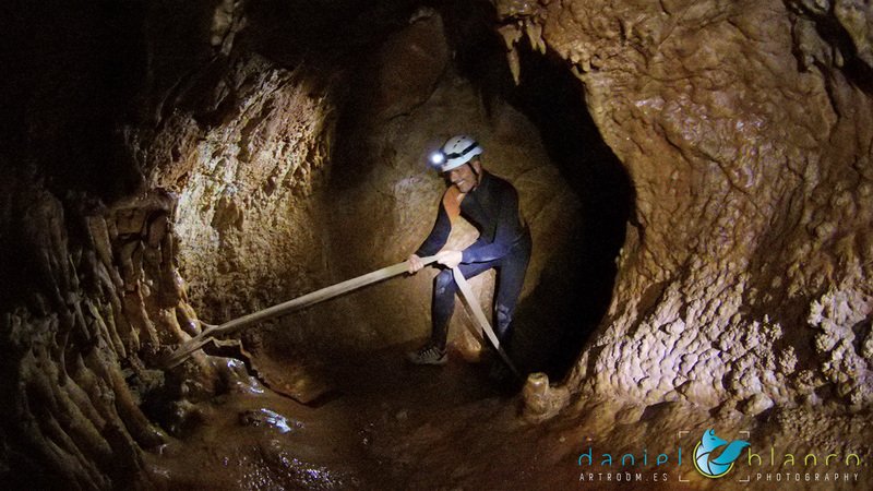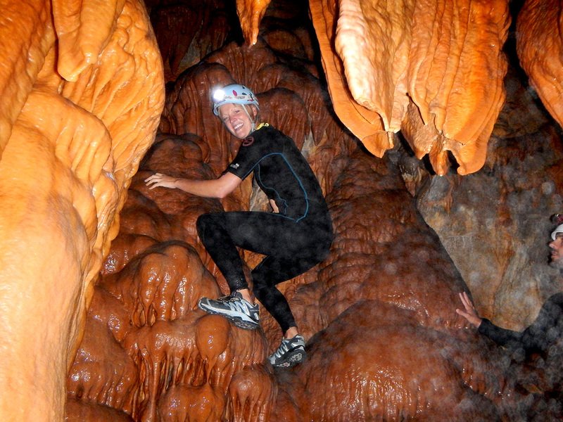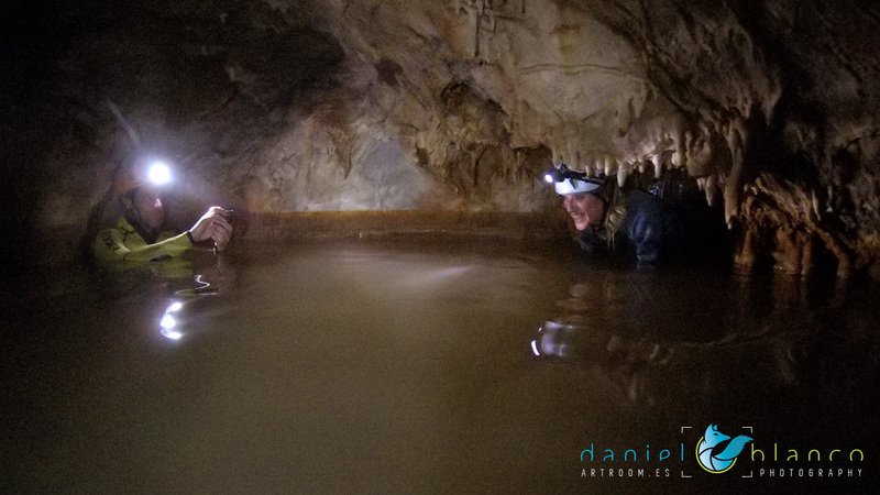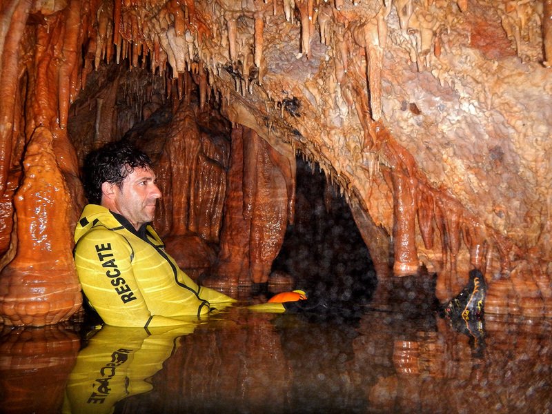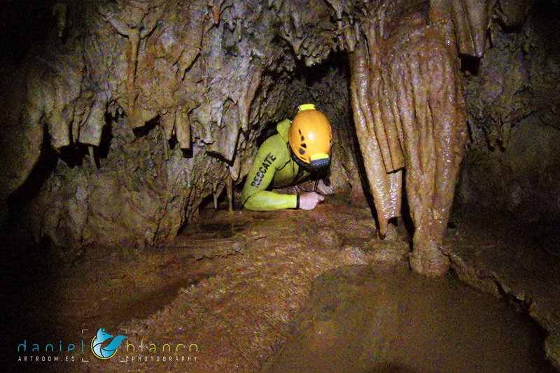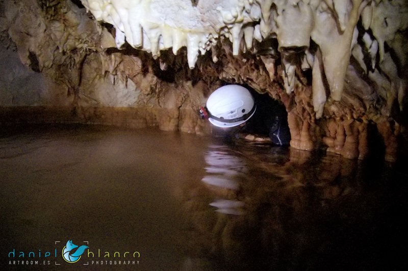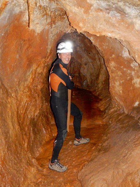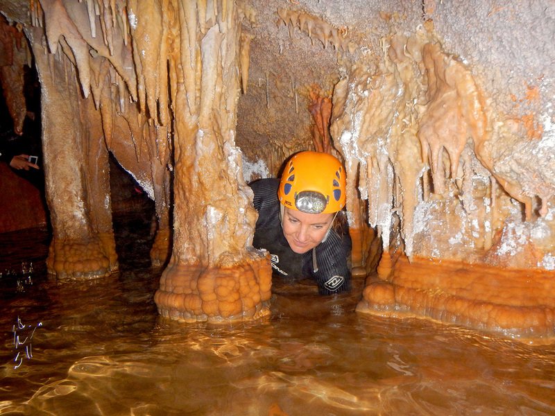 Primero nos adentramos en la cueva de la Excéntrica. La subida hasta la entrada es empinada y rocosa poniendo a prueba nuestros cuadriceps y gemelos, lo cual sirvió estupendamente como calentamiento. El punto de entrada es estrecho, había que pasarlo casi arrastrándose pero daba lugar a una sala espaciosa con techos elevados, permitiendo la progresión de forma cómoda, de pie, en la mayor parte del recorrido, y alejando así cualquier sensación de claustrofobia. Lo que más se podía apreciar eran estalagtitas y estalagmitas, y el color rojizo de las paredes y suelos. Las había de todos los tamaños, pero de formas concéntricas mayormente, de ahí recibe su nombre la cueva. Esta, cuenta con dos partes, una seca y otra húmeda a la que se accede a través de una cuerda. Estábamos tan ensimismados contemplando la riqueza de la roca caliza que a más de uno se nos olvidaba mirar abajo y tener en cuenta que también había un poco de caída y cuando te percatabas se escapaba algún que otro «¡Ahí Dios mio!». Dentro del agua, el recorrido se estrechaba, estabas entre paredes, y podías nadar tranquilamente o caminar e ir viendo y tocando las formaciones a tú paso. Aprovechábamos cualquier trozo de roca parecida a un asiendo para escapar del frio del agua. La naturaleza, que es muy sabia, guarda lo mejor para el final. ¿Quien iba a pensar?, que a través de un hueco sobre el agua parecido a un «anillo» pasaríamos a contemplar un espectaculo «La galería de las excéntricas» con una riqueza en formaciones que quita el sentido: órganos, cortinas, columnas y miles de estalagtitas y estalagmitas decorandolo todo. Antes de salir tuvimos nuestro momento «zen/disfrutón», apagamos las luces de los cascos y nos mantuvimos en silencio escuchando las gotas de agua caer. ¡Fue espectacular!. Una vez fuera la sensación es de haber estado en un verdadero spa. Marisa lo describió perfectamente; ya nunca más volveríamos a pisar aquella zona de la misma manera sabiendo que debajo estaba esa maravilla.