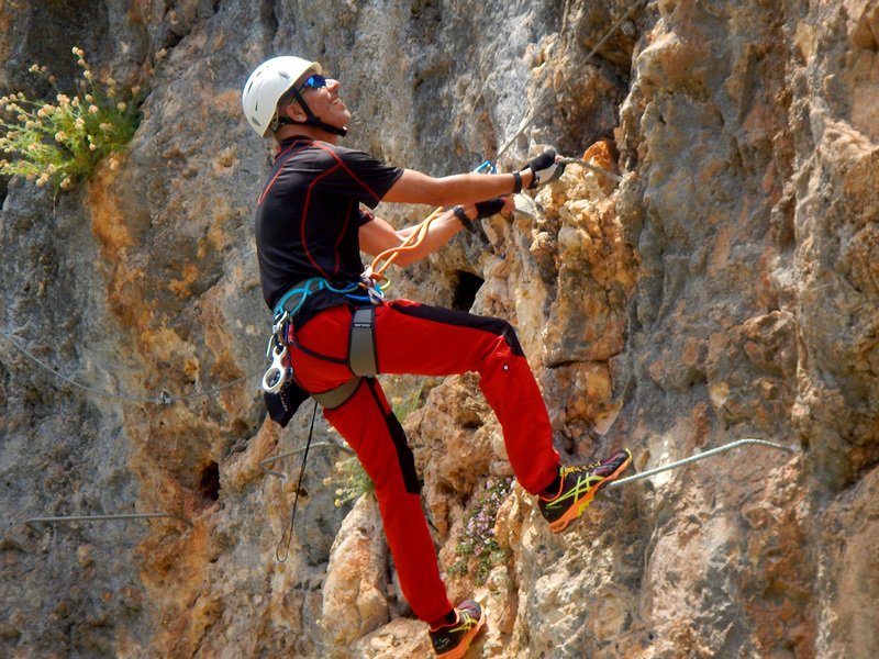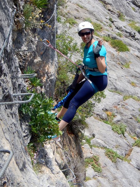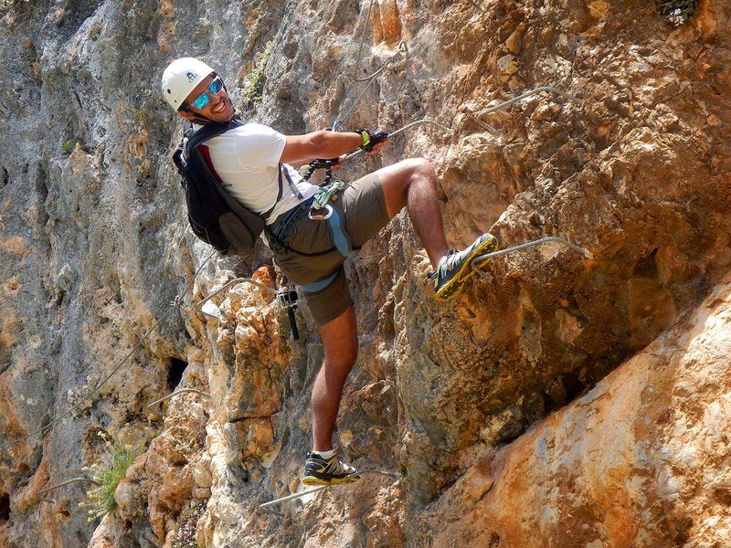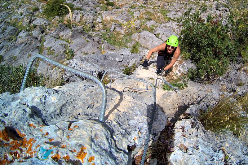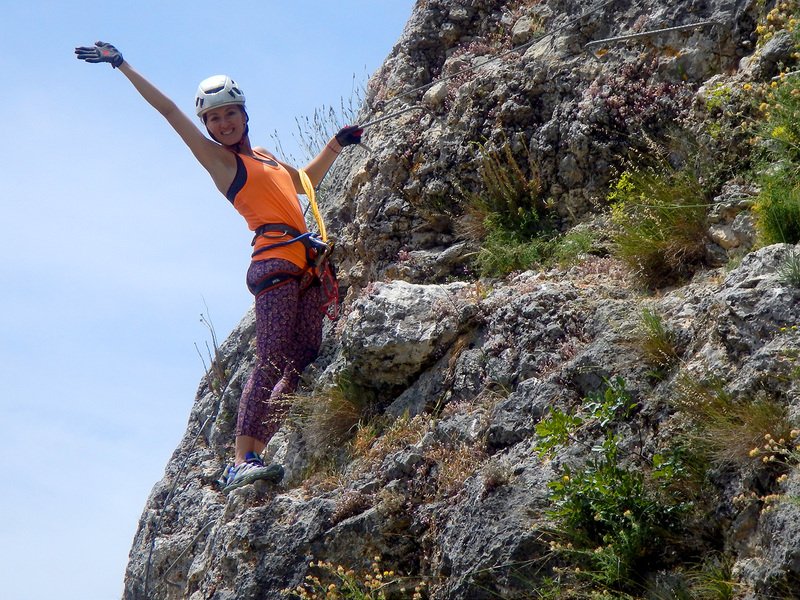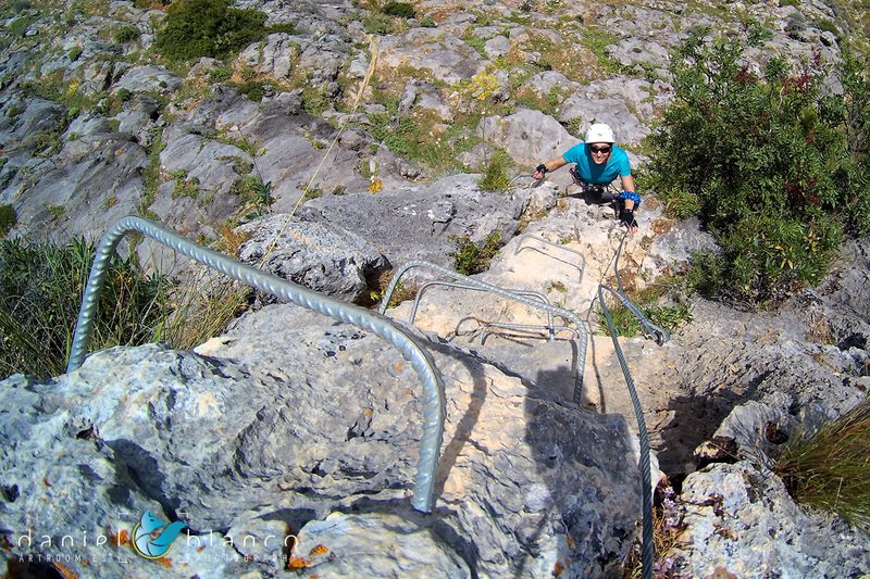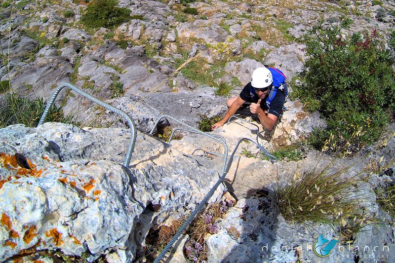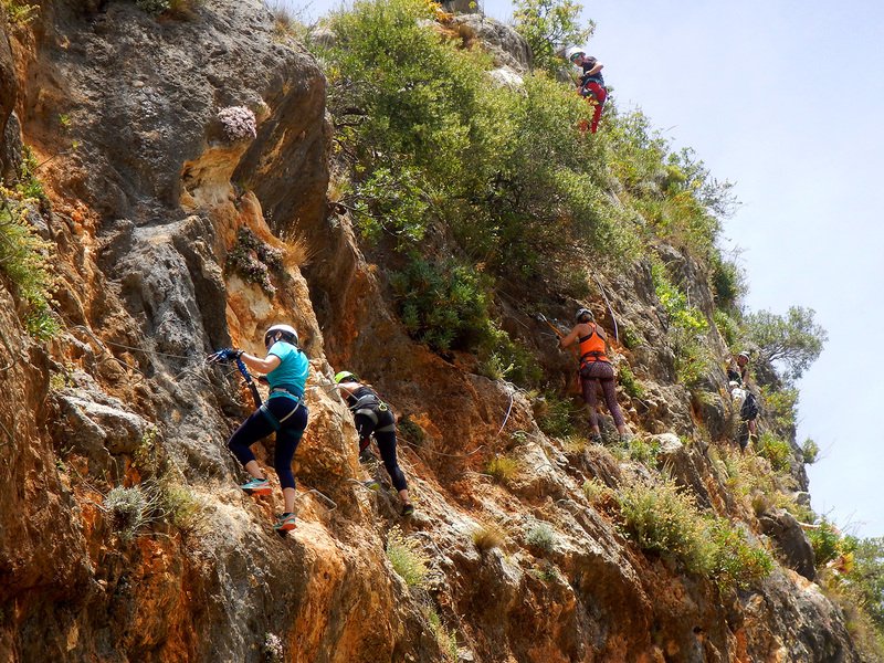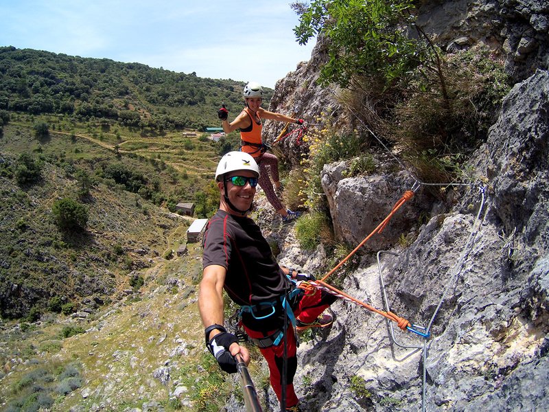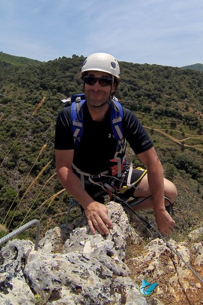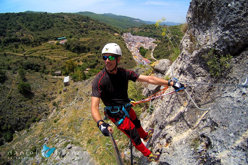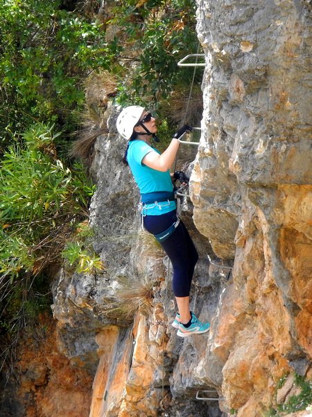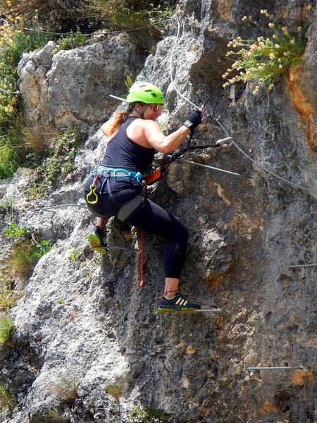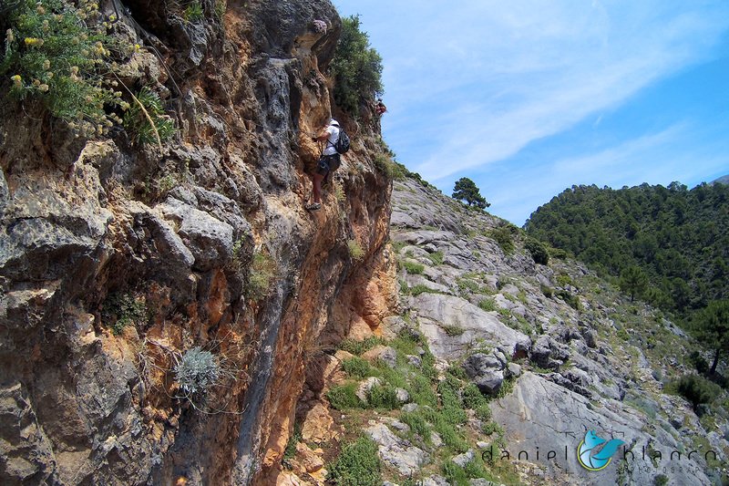 Bajamos la colina casi en silencio, rememorando cada uno mentalmente la experiencia que habíamos vivido. Y nos dispusimos a iniciar nuestra segunda aventura: la Ferrata de Igualeja, pasando por el nacimiento del genal, con esas aguas cristalinas de color esmeralda que van abriendo boca de la belleza del paisaje que nos vamos a ir encontrando. Es una vía perfecta para principiantes, la mayor parte de la travesía en horizontal, aunque tiene subidas, bajadas y tramos desplomados que superan los 30 metros de desnivel. La entrada pone aprueba tus brazos, te vas encontrando con repechos y algunos pasos técnicos, pero tiene buenas zonas de descanso. Utilizar la tercera vaga se convertía en algunos momentos en una delicia más que en una obligación, porque te permitía disfrutar del paisaje y aprovechar la brisa que corría para recuperarse. La sensación al acabar es de que se queda corta, que ha sido poco tiempo.