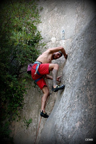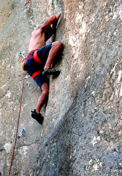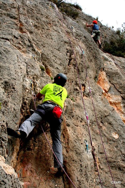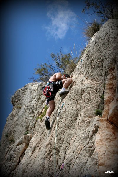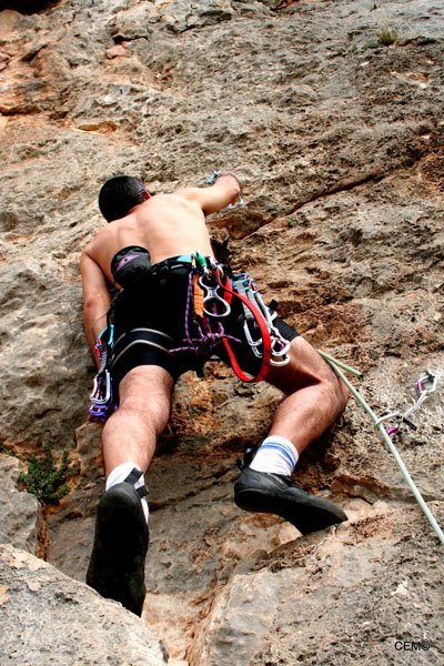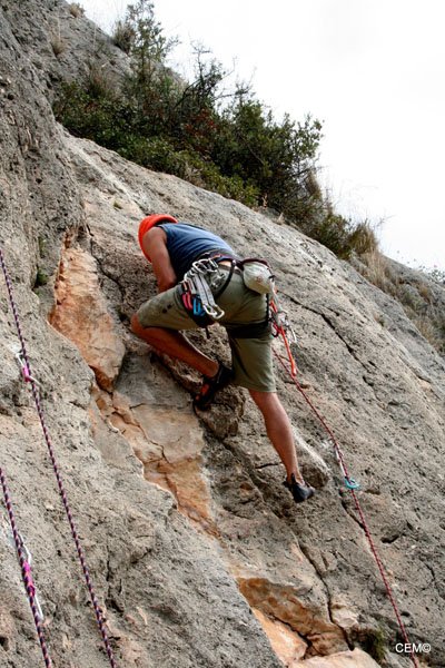 Antes de marcharnos nos vamos a ver al grupo de Agustín. Están en una zona donde las vías son bastantes más duras, y solo para el alcance de algunos privilegiados. Cristian está intentando encadenar la vía La podadera 7a+, tras un par de caídas finalmente lo consigue. Para desmontarla Sarco se ofrece y se curra la vía como si estuviese andando por el paseo marítimo. Se nota que le gusta esta vía, ya que lo hace todo tan fácil que parece que desvirtúa el grado de dificultad, (Makina total). Thomas y Agustín están en una vía de al lado consiguiendo también encadenarla.