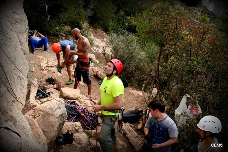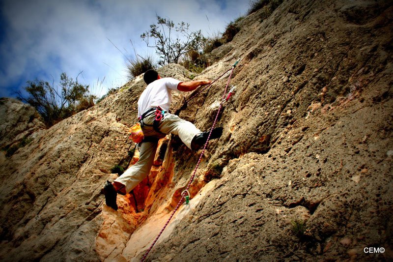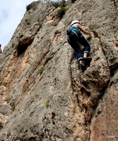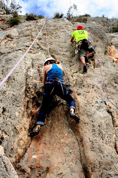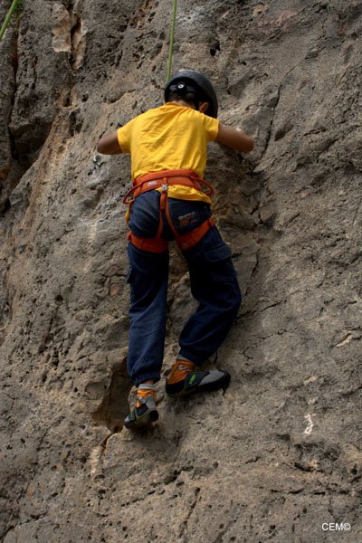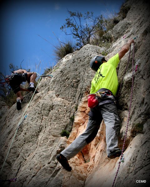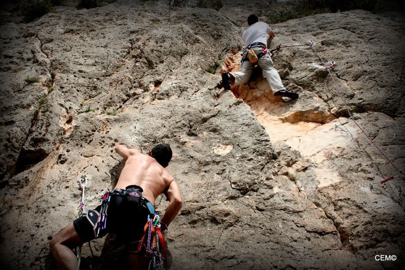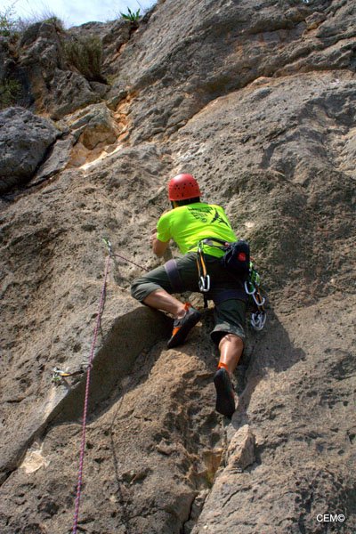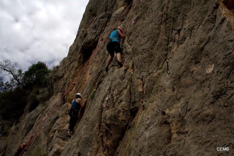 Esta zona tiene vías de escalada para todos los niveles desde el V al 7c+. Para empezar nos dirigimos a la parte más cercana al camino donde predominan los V, V+ y 6a. Tras preparar el material se empezó a montar las vías de menos dificultad. Por un lado Thomas y Agustín, Jesus y Antonio Merino, Maria teresa y (pareja????) y por ultimo Maria del Carmen y Joaquín . Para M. Carmen era la primera vez que aseguraba tras el curso escalada que dio, pero en algún momento tenía que ser la primera vez que lo hiciese ella sola. Tras un breve recordatorio, nos ponemos a escalar y todo sale perfecto. Tras encadenar e instalar las vías nos vamos alternando en el aseguramiento y en la escalada. Poco a poco van encadenando las vías. Sobre el mediodía se nos unes Sarco Y Christian que se van a vías más complicadas junto a Agustín y Thomas.