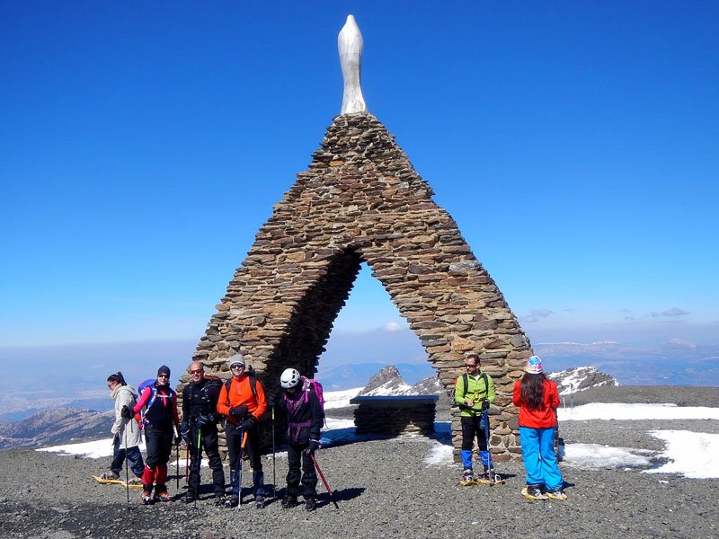 Trás las primeras palas de nieve, bastante en mejor estado de lo que pensábamos, hacemos una paradita de 1 minuto para la típica foto de grupo en la Virgen de las Nieves, no llevamos ni 10 minutos avanzando y ya vamos sudando.