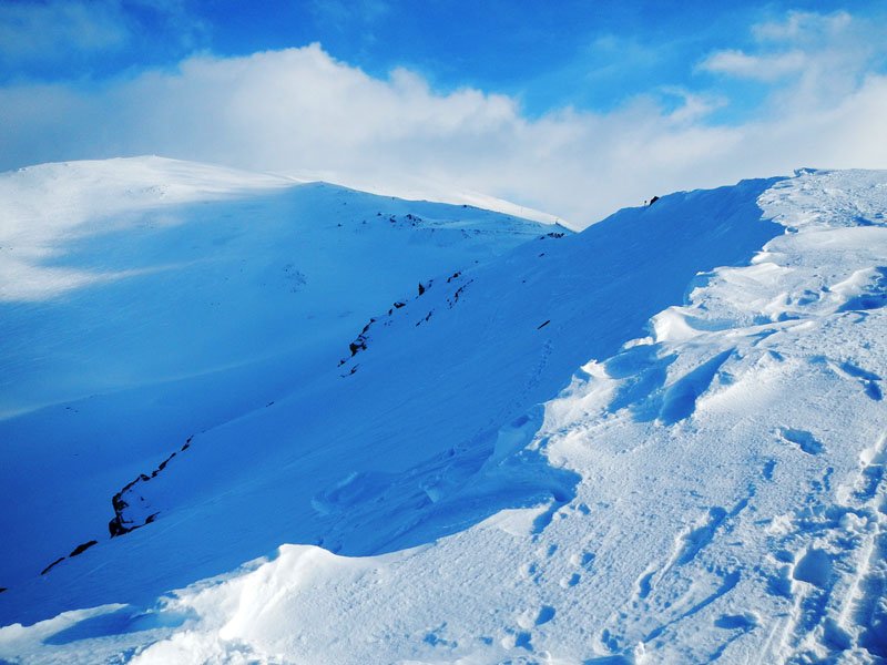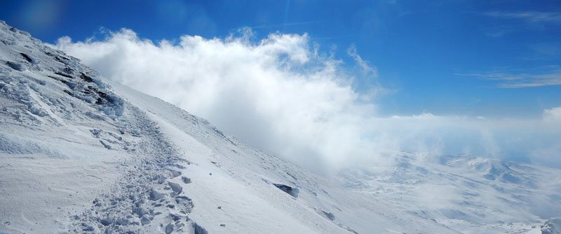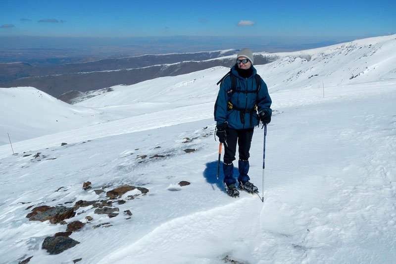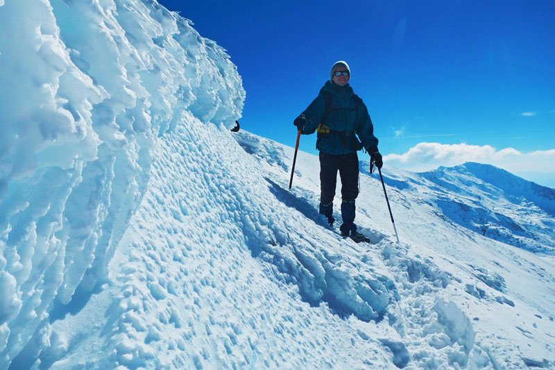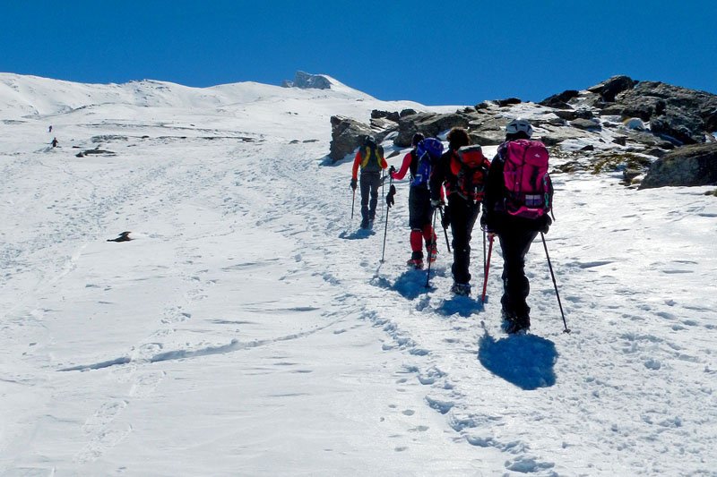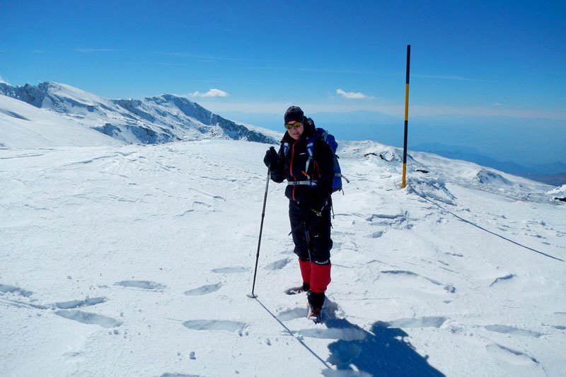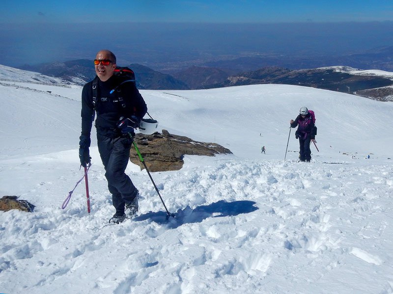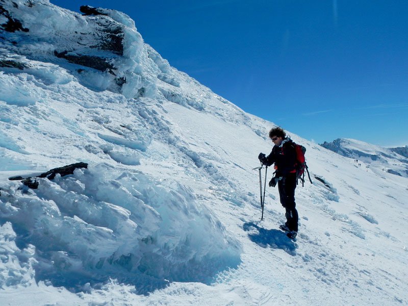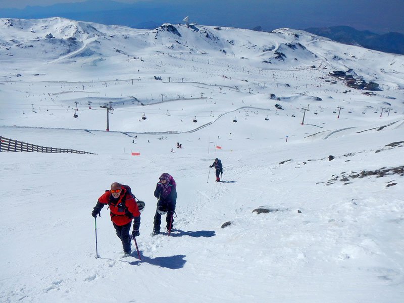 Seguimos subiendo, la inclinación de la pendiente va en aumento y hay que tratar de seguir la trazada de nuestro compañero, ya que fuera de la misma la nieve está muy blanda, clavándonos más de 20 cms. en ella al avanzar, lo cual hace aun más dura la subida. A pesar de estar bajo cero y habernos aligerado mucho de ropa, nos caen los chorros de sudor por la cara. Eso si, las vistas son maravillosas, todo alrededor nuestra es blanco, cuando llegamos al final de una gran cuesta, vamos viendo al fondo (curiosamente cada vez parece estar más lejos en lugar de más cerca) nuestro destino final, el pico del Veleta, majestuoso, invitándonos a superar el cansancio y seguir adelante.