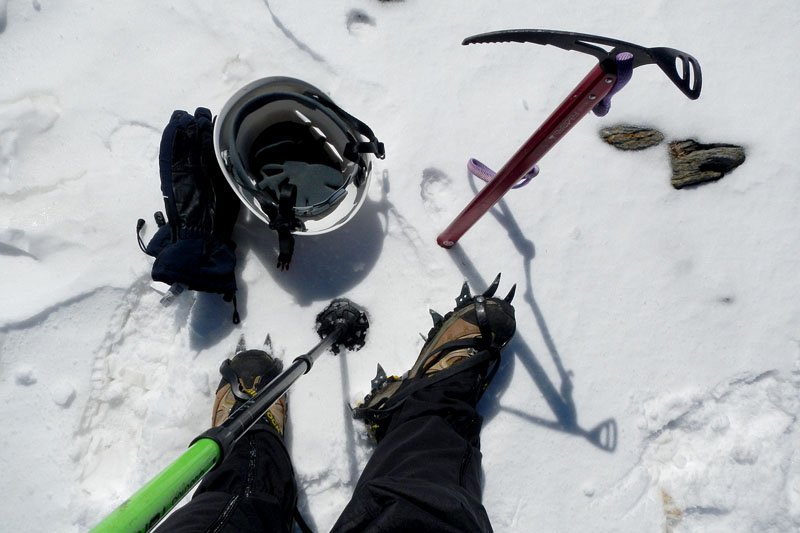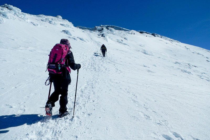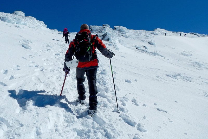 Ya desde los primeros pasos podemos comprobar que la subida va a ser extremadamente dura, avanzar clavando los crampones en la nieve, tirar de ellos y levantar el pie de la nieve, y volver a bajar con fuerza para clavar otra vez, un paso tras otro, es mucho más duro de lo que parece.
