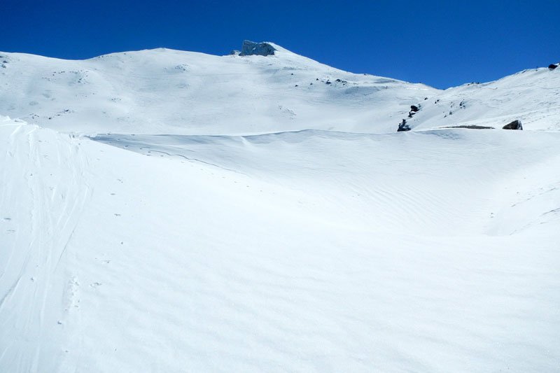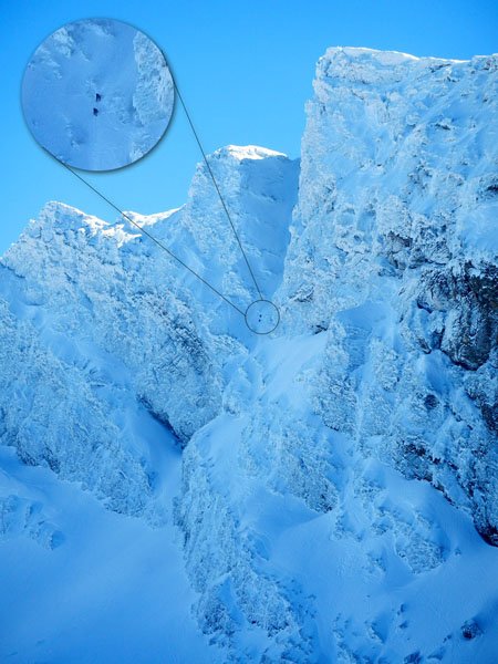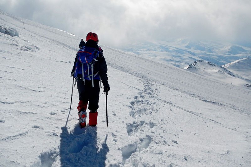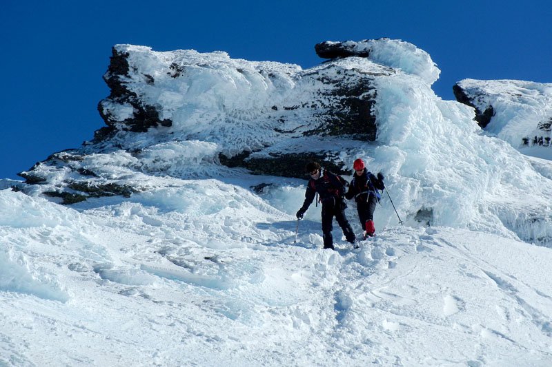 El paisaje es cada vez más espectacular, dejamos abajo la estación de esquí, cada vez nos cruzamos con menos esquiadores, a los que vemos deslizarse por la blanca nieve como pequeñas hormiguitas negras muy abajo. Seguimos subiendo casi sin descanso, alguna cortísima parada para una rápida foto, para coger aliento o beber y comer algo ligero. El frío ya se empieza a notar bastante (la temperatura ya debía rozar los -10º) y tenemos que abrigarnos bastante más, a pesar de que seguimos sudando por el tremendo esfuerzo de la subida.