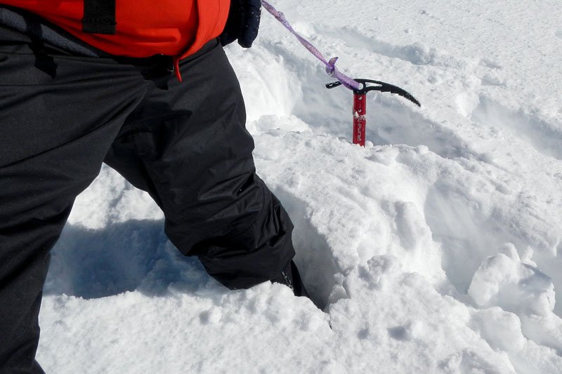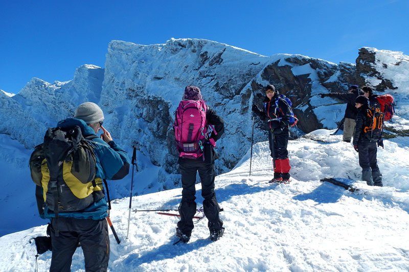 El avance es muy lento, ya que cualquier error puede ser muy peligroso. Un pequeño resbalón de un miembro del grupo que consigue clavar a tiempo el piolet en el hielo para frenar su caída de unos metros por la ladera helada (gracias Javi por toda la técnica que nos has ido enseñando a lo largo de la subida, je je), seguido de otra caída del organizador de la actividad al intentar ayudar a esta persona, hacen que una vez han vuelto ha subir donde estamos los demás y solo teniendo que lamentar la pérdida de un bastón que desapareció resbalando por el hielo ladera abajo, nos hacen replantearnos el avance por este punto.