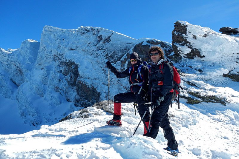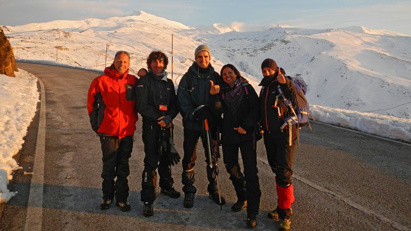 Aprovechamos para hacer un pequeño alto, inmortalizarnos en fotografías en ese impresionante lugar a 3.100 metros sobre el nivel del mar, con el pico del Veleta, el Mulhacen, la Alcazaba y demás tresmiles enfrente nuestra. Aunque ya había estado allí y me había parecido espectacular, no lo había hecho en invierno, y realmente te deja sin palabras. Nos llama la atención dos minúsculos puntos negros que vemos en un cortado justo debajo del pico, en una pared totalmente vertical, sobre todo cuando descubrimos que son alpinistas escalando por ahi, impresionante.