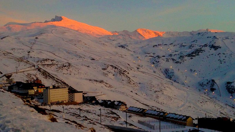 Llegando a la Hoya de la Mora, donde nos quitamos el equipo de nieve para afrontar el último tramo de asfalto hasta donde habíamos dejado el coche hace casi 7 horas, podemos disfrutar de un espectacular atardecer alpino, que ilumina de naranja la cumbre del Veleta con literalmente el último rayo de sol del día. El pico se ha despejado de nuevo como queriendo invitarnos a intentar subir de nuevo otro día, le tomamos la palabra.