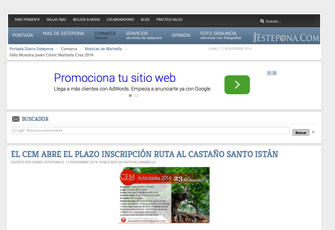 El Club de Escalada Marbella (CEM) ha abierto el plazo de inscripción para la ruta que ha organizado este domingo, 23 de noviembre, hasta el Castaño Santo de Istán, por la zona del Hoyo del Bote. Los socios podrán elegir si quieren realizar la actividad en bicicleta, 14 km de subida y de dificultad media y 14 km de bajada; corriendo, en este caso con un recorrido de 10 km de subida y dificultad media más 10 km de bajada; o caminando, con un recorrido que será de 5 km de subida y dificultad baja, más 5 km de bajada.