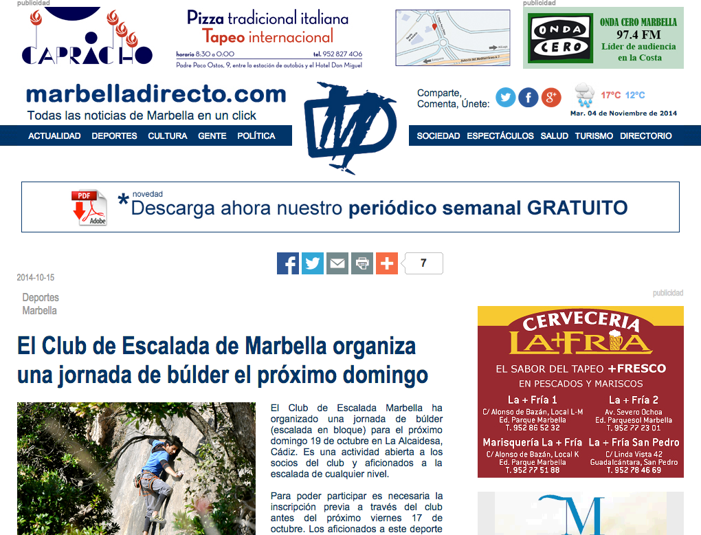 El Club de Escalada Marbella ha organizado una jornada de búlder (escalada en bloque) para el próximo domingo 19 de octubre en La Alcaidesa, Cádiz. Es una actividad abierta a los socios del club y aficionados a la escalada de cualquier nivel.
