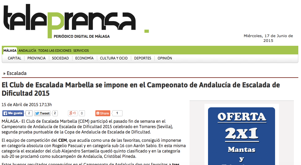 El Club de Escalada Marbella (CEM) participó el pasado fin de semana en el Campeonato de Andalucía de Escalada de Dificultad 2015 celebrado en Tomares (Sevilla), segunda prueba puntuable de la Copa de Andalucía de Escalada de Dificultad.