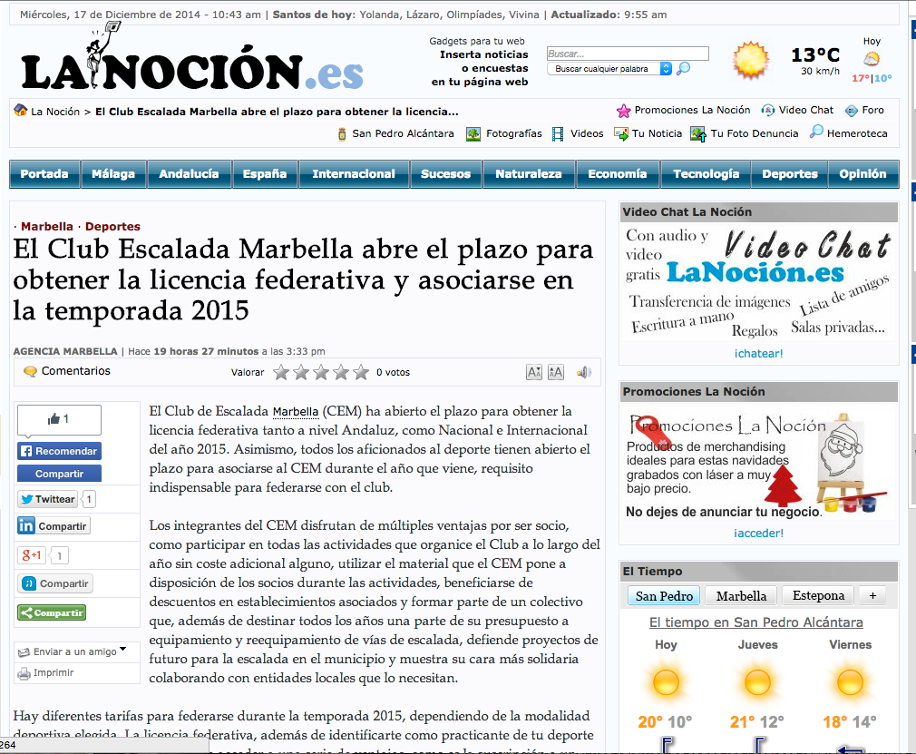 El Club de Escalada Marbella (CEM) ha abierto el plazo para obtener la licencia federativa tanto a nivel Andaluz, como Nacional e Internacional del año 2015. Asimismo, todos los aficionados al deporte tienen abierto el plazo para asociarse al CEM durante el año que viene, requisito indispensable para federarse con el club.