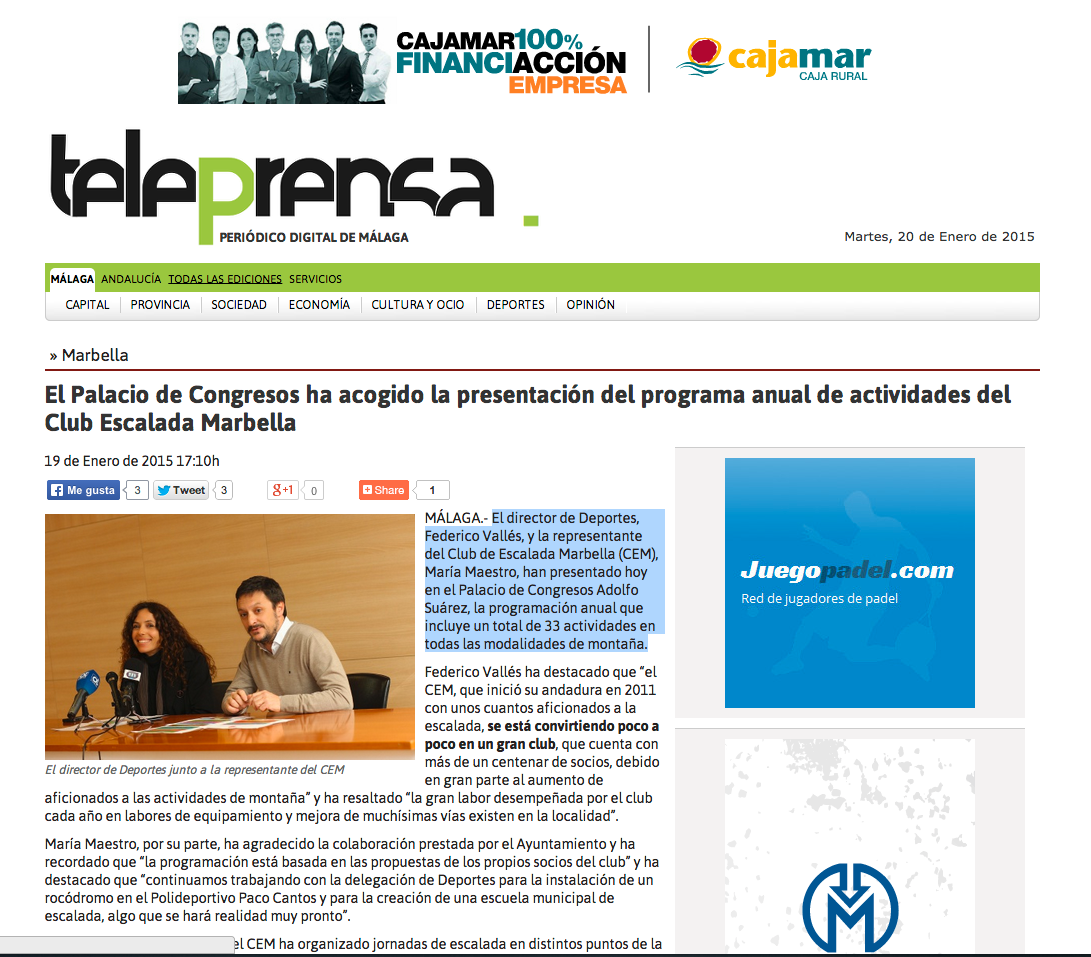 El director de Deportes, Federico Vallés, y la representante del Club de Escalada Marbella (CEM), María Maestro, han presentado hoy en el Palacio de Congresos Adolfo Suárez, la programación anual que incluye un total de 33 actividades en todas las modalidades de montaña.