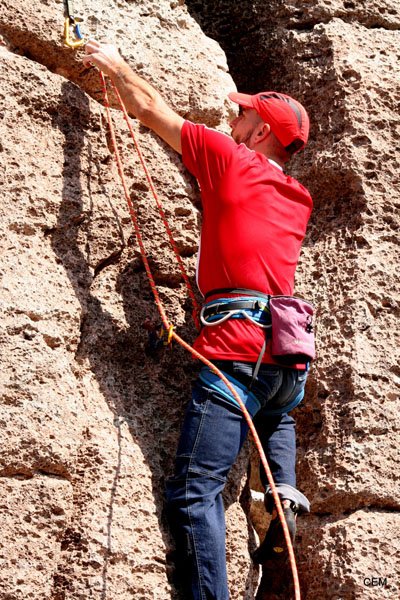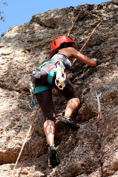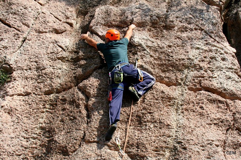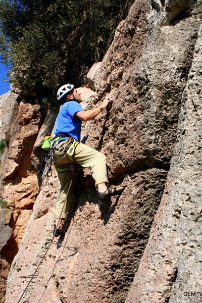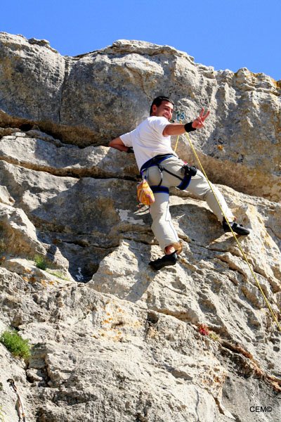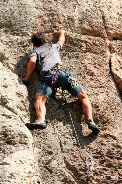 La zona elegida: las Mesas. Roca caliza de gran calidad, en la que sus gotas de agua son poco agarre, para unos dedos que intentaban buscar en unas fisuras, casi ciegas, unos cantos que nos negaban. La única opción para continuar trepando: «Pies, muchos pies.´´Que encuentran en esas gotas un magnifico aliado para agarrarse.
