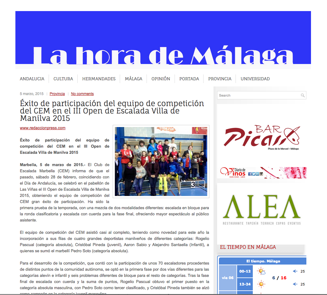 Éxito de participación del equipo de competición del CEM en el III Open de Escalada Villa de Manilva 2015 Ver imagen más grande Éxito de participación del equipo de competición del CEM en el III Open de Escalada Villa de Manilva 2015 CEM2015-03-06T09:24:10+01:00 Artículos relacionados Vertiginoso fin de semana de participaciónes de nuestros Corredore/as Montañero/as 25/03/2026 Otro exitoso fin de semana de participación y resultados de nuestro pequeños corredores por montañas del CEM en la Tajillo Kids 25/03/2026 Actividad de Marcha Nórdica y Senderismo Castaño Santo 22/03/2026