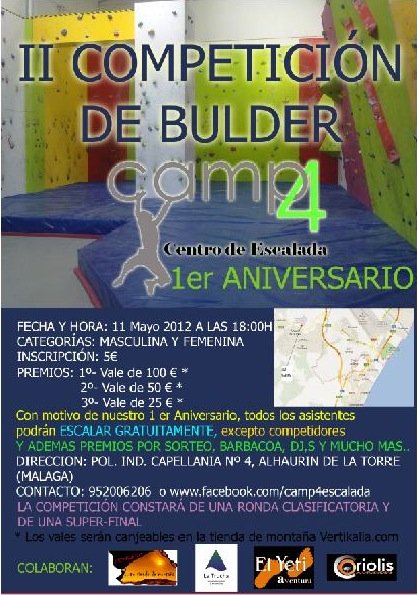 Ven a este especial evento en el que los asistentes podran escalar gratis a la vez que se desarrolla la competicion. Y ademas habrá premios por sorteo, DJ,S, barbacoa, comida, bebida y muchas ganas de pasar una buena tarde de escalada!!