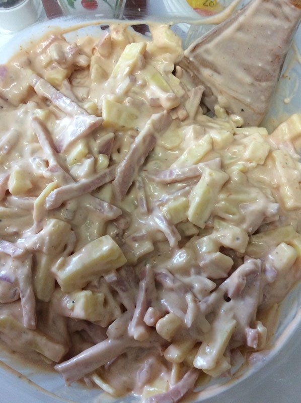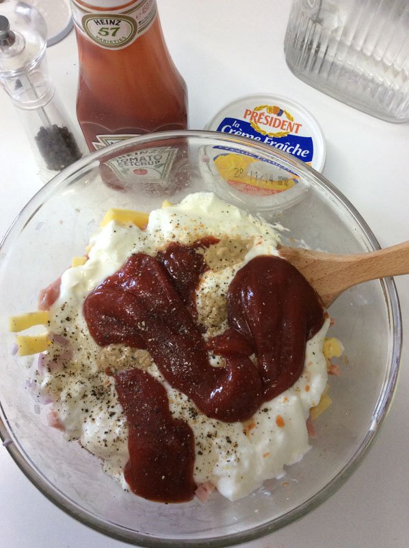 Cortar el Jamón york en tiras largas y finas el queso en tiras mas cortas y mezclar con el resto de los ingredientes.  Dependiendo de los gustos se pueden modificar las cantidades de mostaza y ketchup. Si se precisa sal se le añade al final después de mezclar bien los ingredientes.
