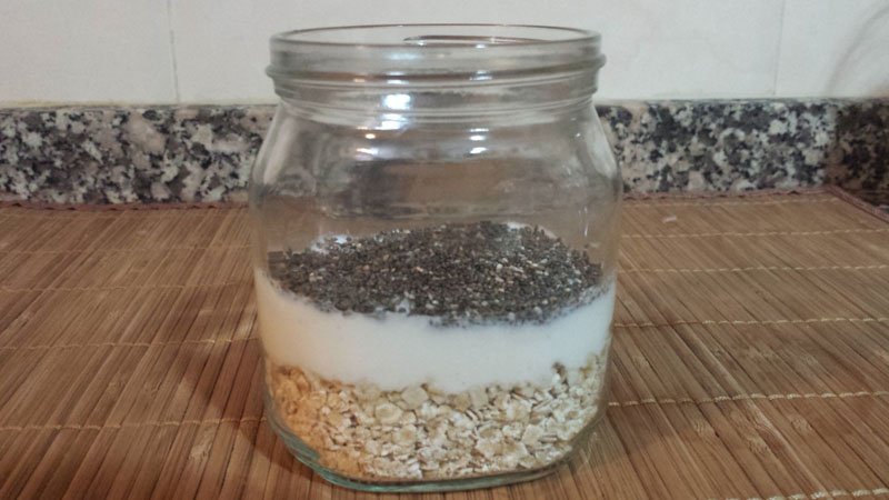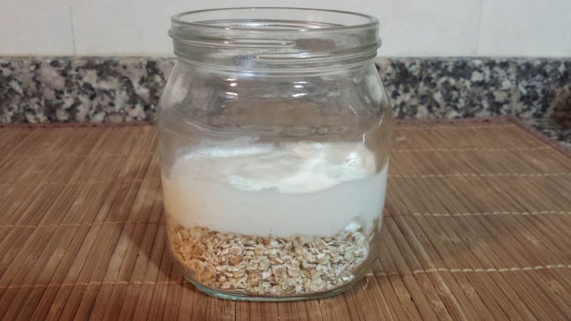 En un recipiente de cristal se echa media vaso de avena cruda, una cucharada grande se semillas de chía, media vaso de alguna leche vegetal, en este caso leche de almendras, un yogur griego o natural (yo he utilizado un yogur natural sin lactosa) y miel al gusto (también se puede usar cualquier otro tipo de endulzante natural como sirope de agave o estevia).