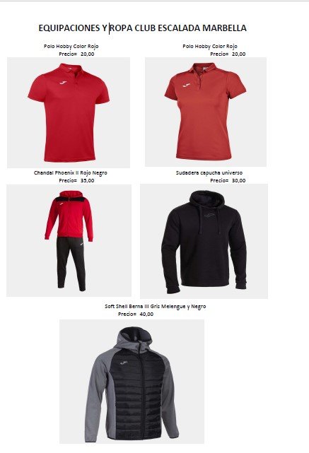 El club ha adquirido algunas unidades de las cuatro prendas para hacer tallaje, y por ello los socios que quieran o estén interesados en adquirir una prenda, les emplazamos en la sede del Club Escalada Marbella en el Polideportivo Paco Cantos para que puedan probarse estas prendas y poder hacer los encargos de las mismas, lunes 3 de marzo a 7:30 de la tarde.